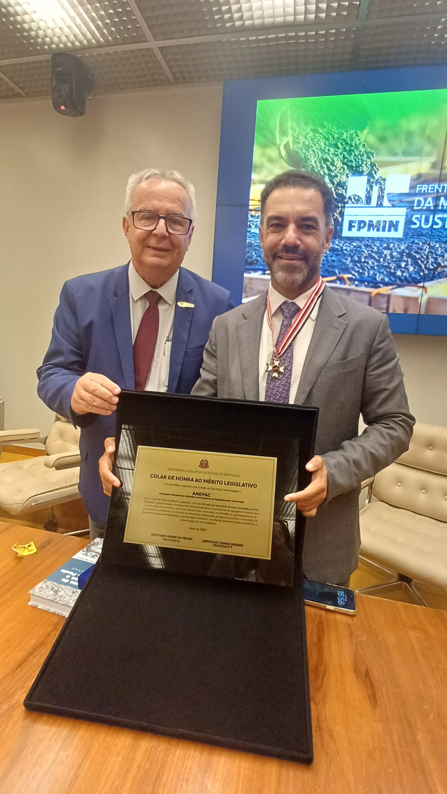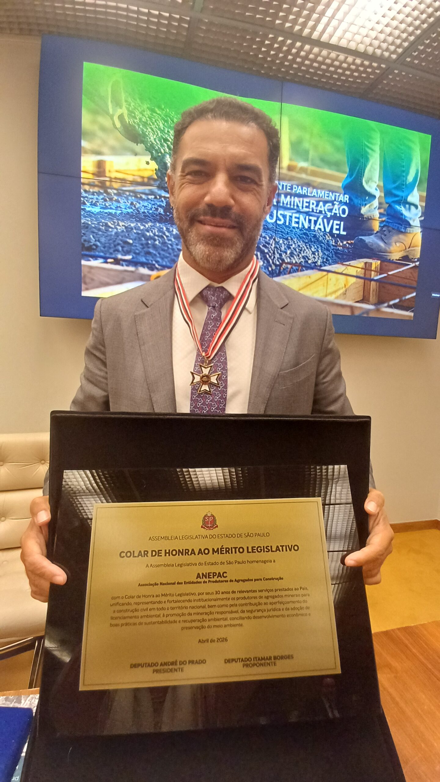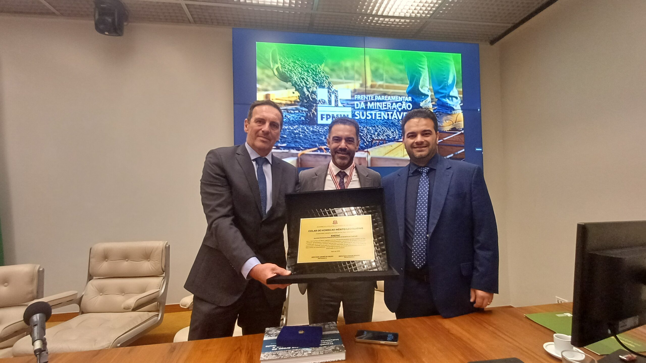 Na última terça-feira, 14 de abril, a ANEPAC foi homenageada no Congresso Nacional pela Frente Parlamentar da Mineração Sustentável (FPMin), liderada pelo deputado federal Zé Silva, em reconhecimento aos seus 30 anos de atuação na defesa e representação do setor de agregados no Brasil. A homenagem foi realizada durante o seminário “O Papel Estratégico dos Agregados para o Futuro da Infraestrutura e a Construção de um Brasil Sustentável”, conduzido pelo deputado federal Arnaldo Jardim em parceria com o deputado estadual por São Paulo, Itamar Borges, reunindo autoridades, lideranças institucionais e representantes do setor para discutir os desafios e oportunidades da mineração de agregados no país.